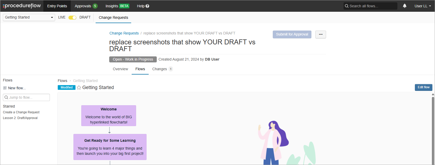When viewing a flow, click Edit flow at the top right. You can choose to continue editing within an open change request or start a new change request. If you enter a Change Request Title and click Start change request + edit flow, the flow opens in the editing canvas.