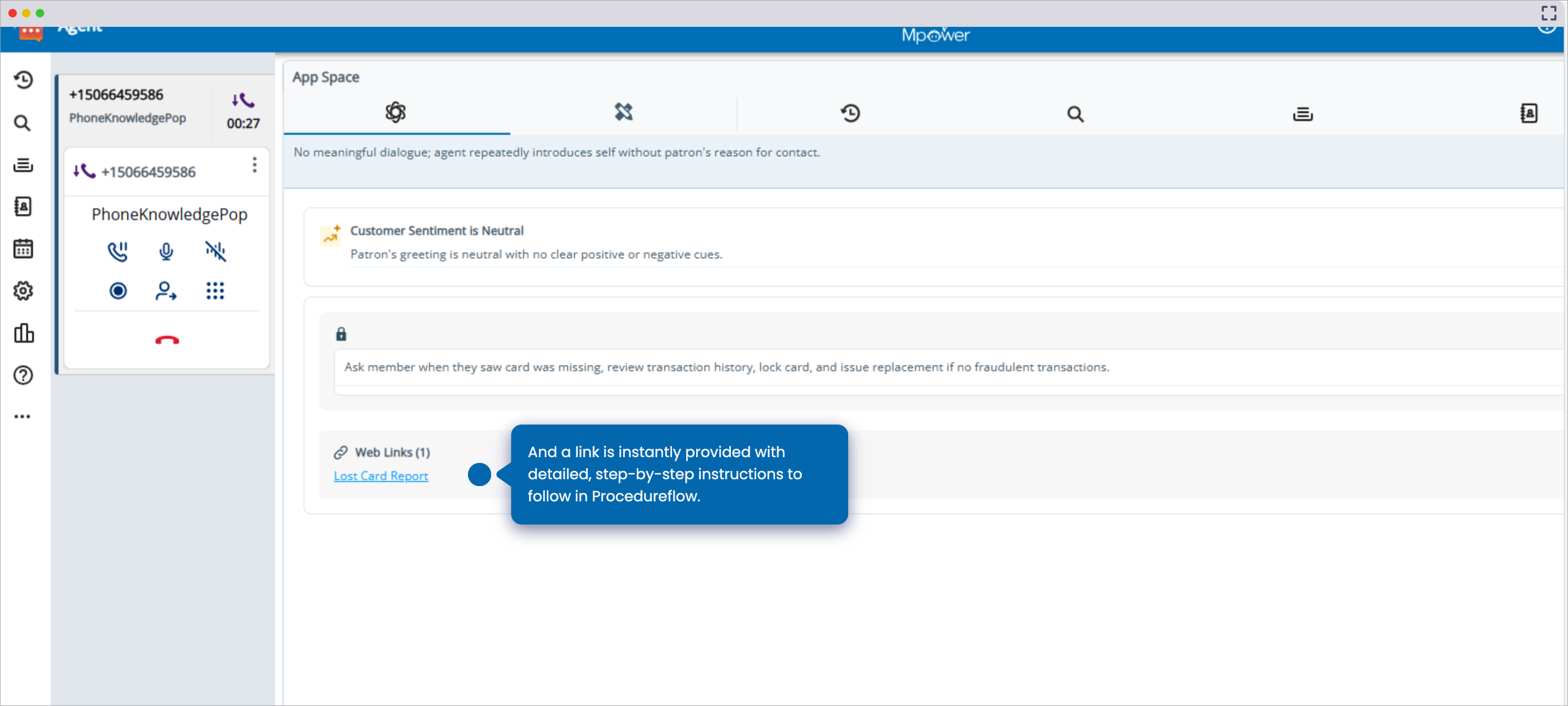 During calls, Agent Assist identifies the interaction context and surfaces the most relevant Procedureflow flow as an article within the Agent Assist interface. The article includes a link to open the full Procedureflow flow directly, while keeping the customer interaction active in CXone.
