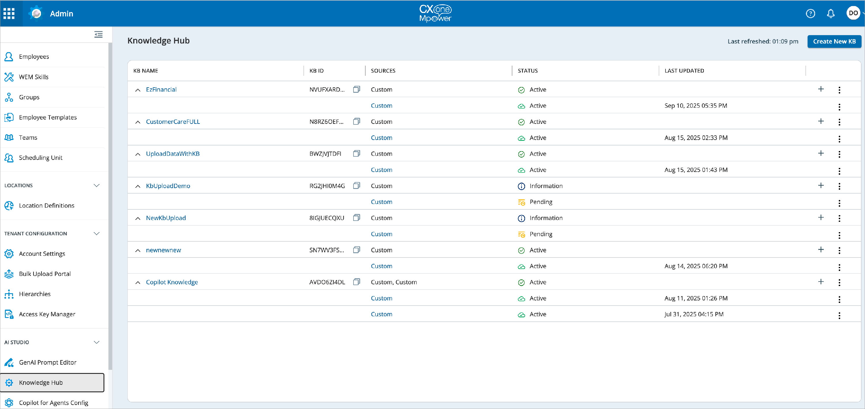 The following image shows the knowledge bases in the Knowledge Hub; each knowledge base corresponds to a Procedureflow entry point with the same name.