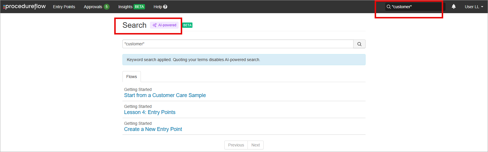 AI Search is currently in beta. Contact Procedureflow to opt-in. Please share your feedback using the in-app feedback form.